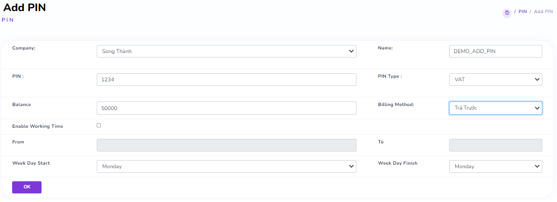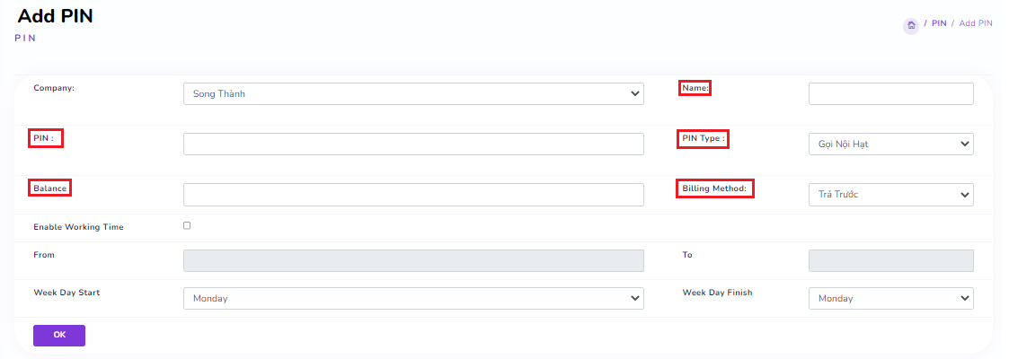 Billing Method: The management method for the PIN. (Prepaid means the balance must be positive to make calls; Postpaid allows calls even with a negative balance.)