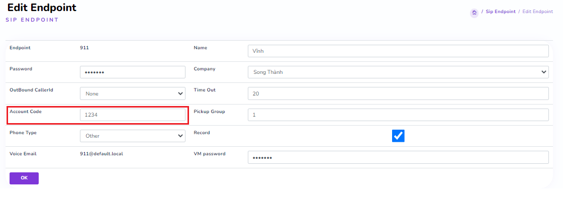 Enter the created “PIN” into the “Account Code” field of the “SIP Endpoint” → Click “OK”