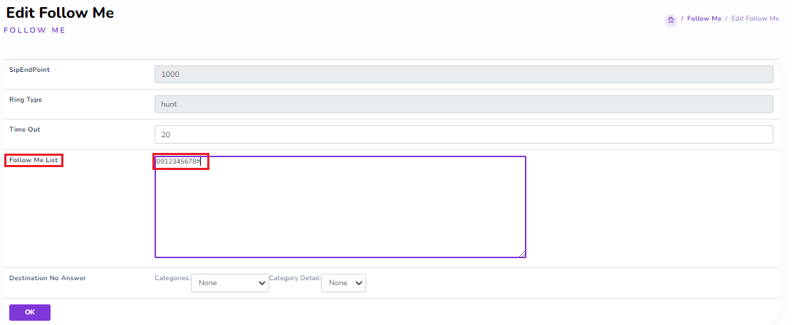 Enter the details into the “Follow Me List” table.