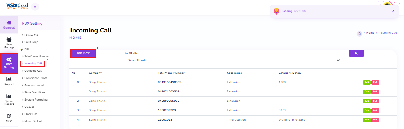 Select “Edit” to modify the incoming call settings for the corresponding number, or “Add New” to create a new one