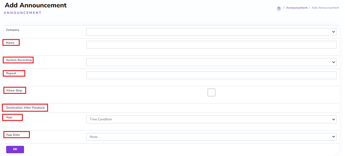 Create/Customize a company greeting script with no key interaction. In the "PBX Settings" tab, select "Announcement" and click "Add New"