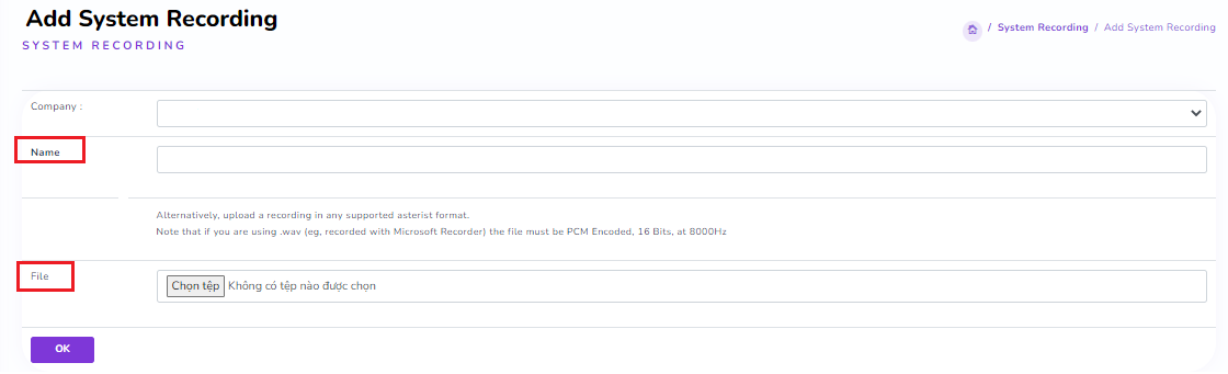 Note: The recording file must be in the correct format for the PBX system (file .wav, mono, PCM Encoded, 16 Bits, at 8000Hz). Click OK.