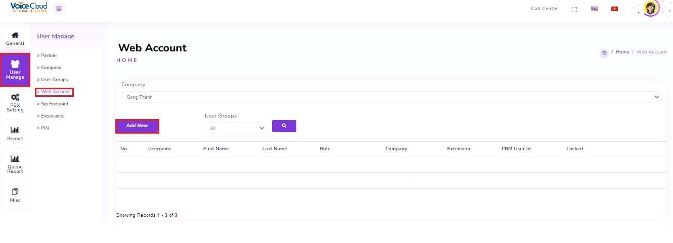 In the "User Management" tab, select "Web Account" and click on "Add New"