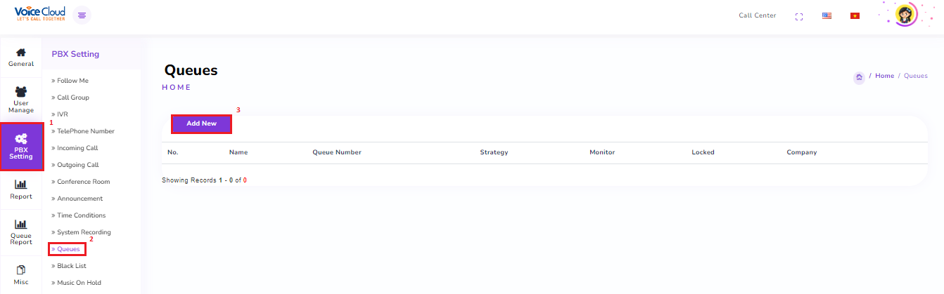 In the "PBX Settings" tab, select "Queues"