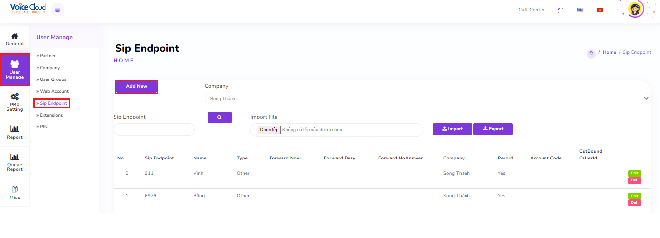 In the "User Management" tab, select "SIP Endpoint" and then click on "Add New"