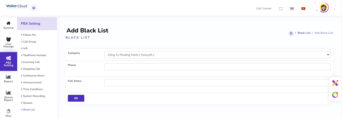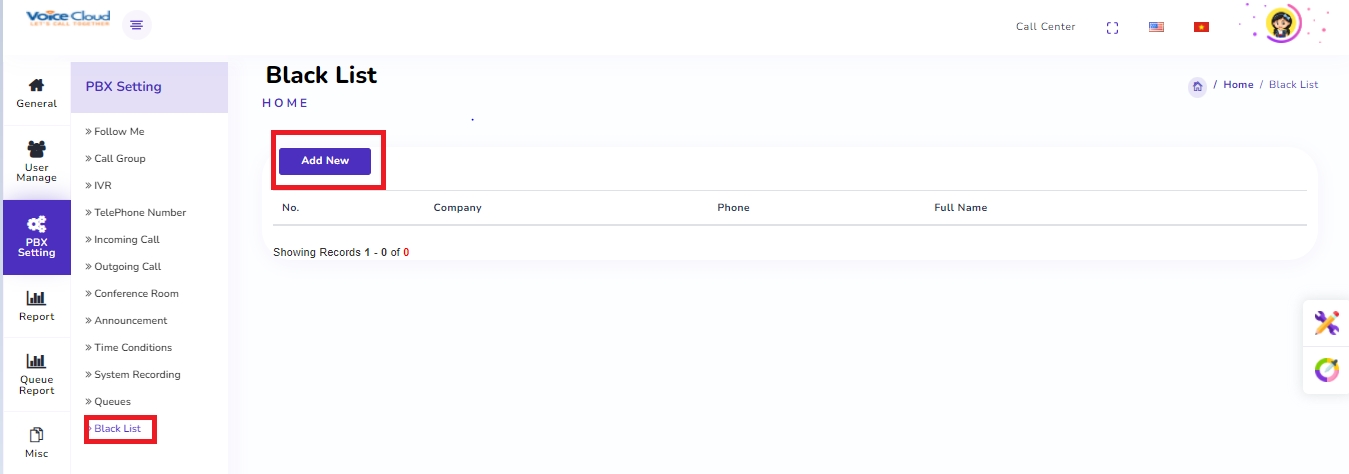 In the “PBX Settings” tab, select “Black List” and click “Add New”
