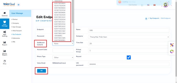In the “Outbound Caller ID” section, select the number you want to use for outbound calls for that extension. Then click “OK” as shown in the image.